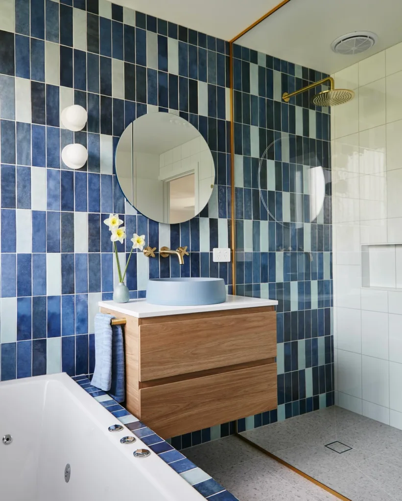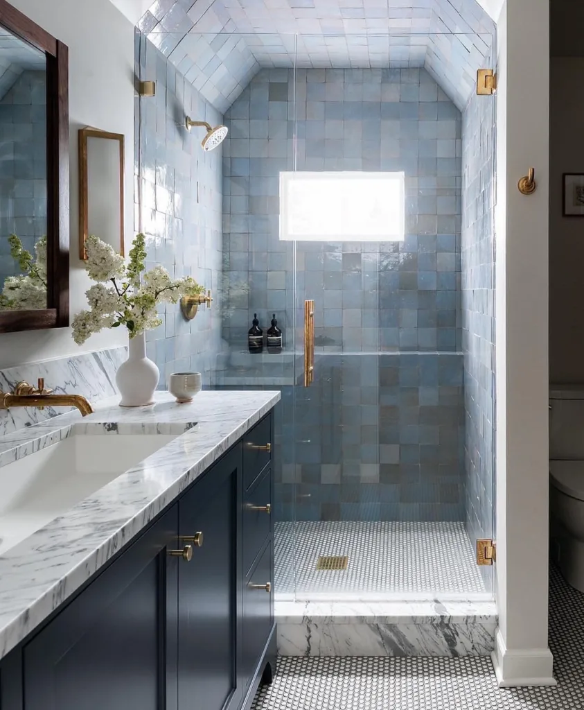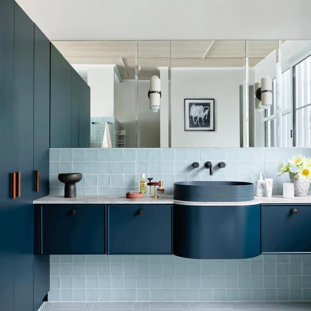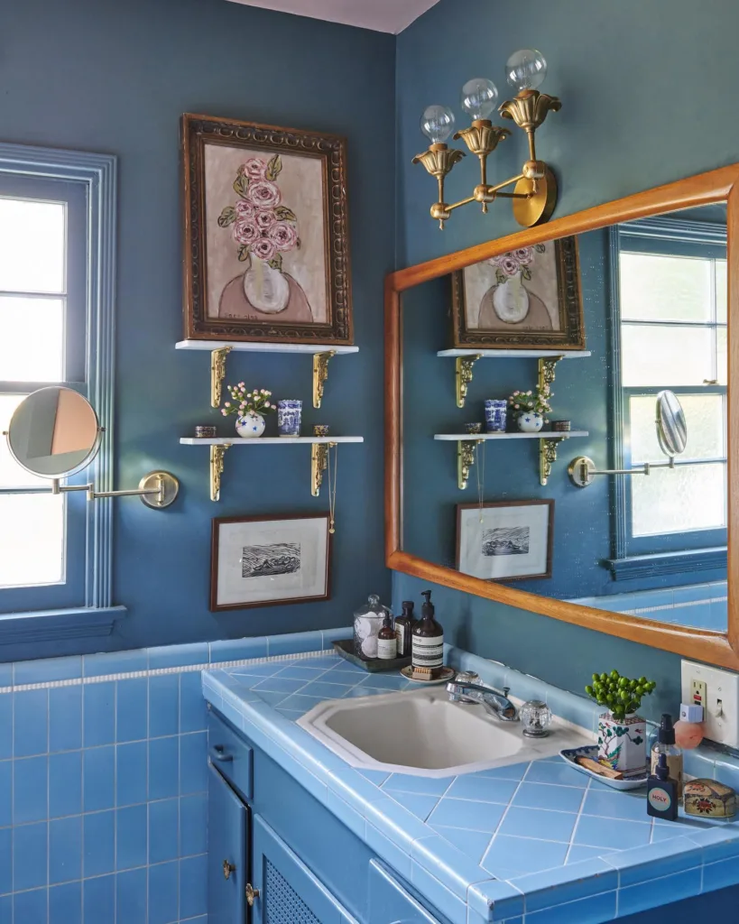Another trend is the use of blue in unexpected places, like ceilings or cabinet interiors, for a surprise pop of color. Mixed metals—brass, chrome, and matte black—pair beautifully with blue, creating a balanced, luxurious look. For those who love maximalism, combining multiple shades of blue in one space, like a navy vanity with turquoise tiles and sky-blue walls, creates a vibrant, eclectic vibe.
