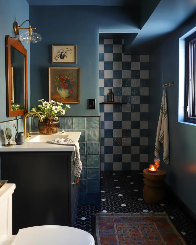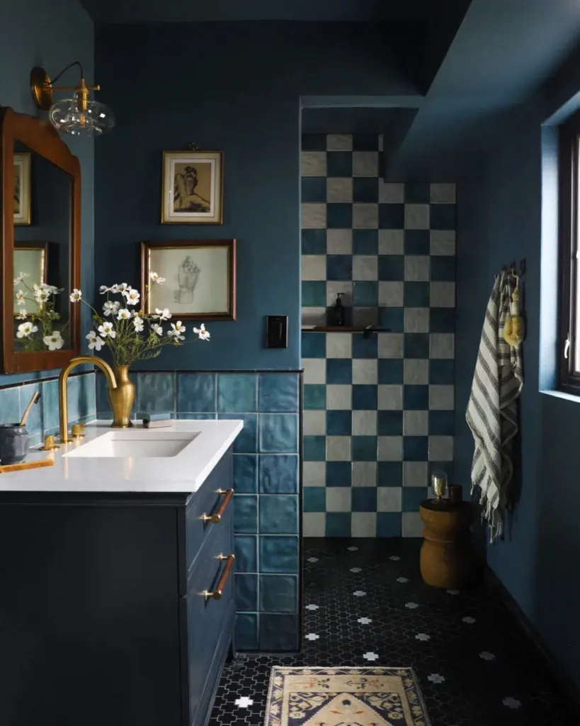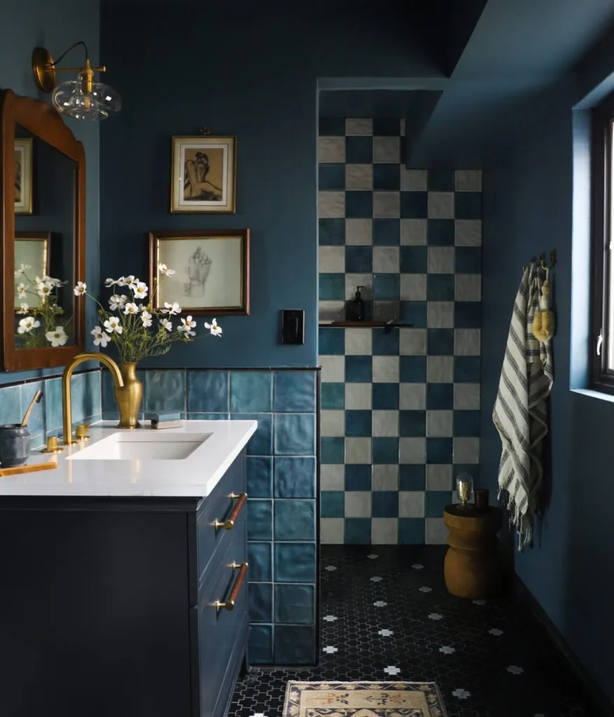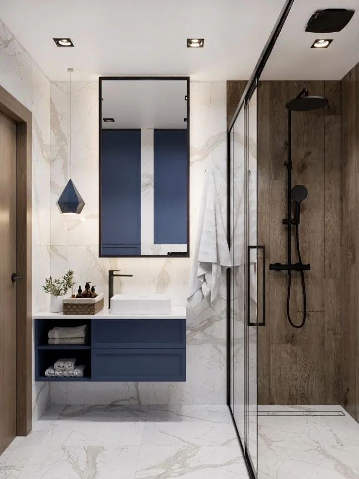 Another trend is the use of blue in unexpected places, like ceilings or cabinet interiors, for a surprise pop of color. Mixed metals—brass, chrome, and matte black—pair beautifully with blue, creating a balanced, luxurious look. For those who love maximalism, combining multiple shades of blue in one space, like a navy vanity with turquoise tiles and sky-blue walls, creates a vibrant, eclectic vibe.