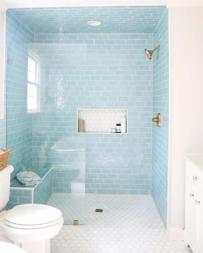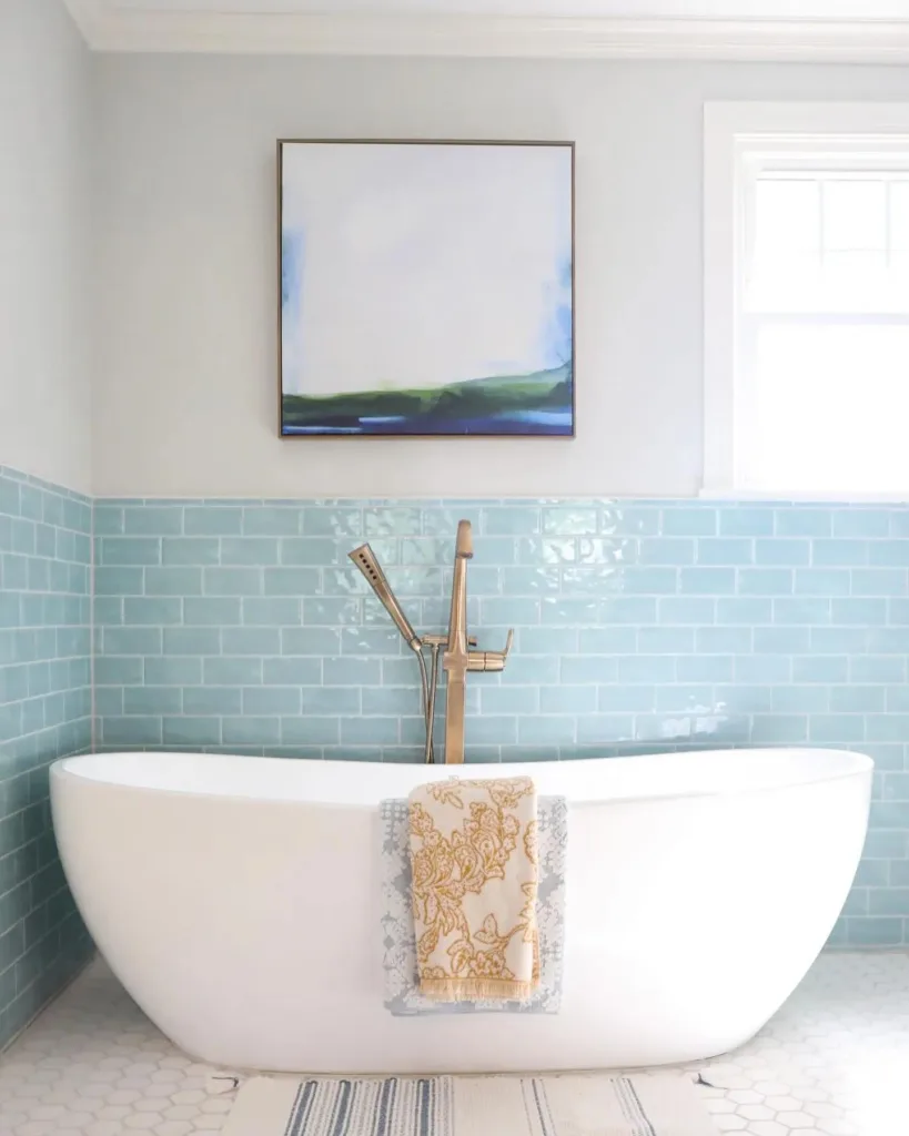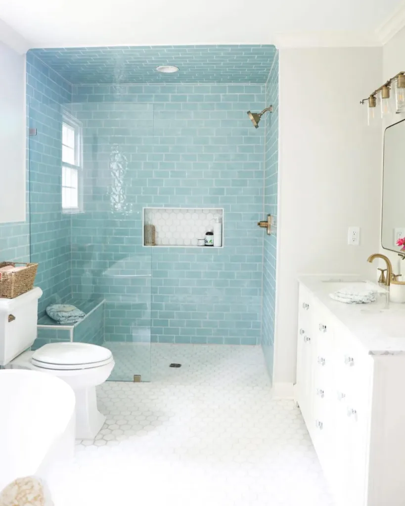 Light shades like sky blue, powder blue, or aqua are ideal for small bathrooms as they make the space feel larger and more open. Pair with white or light gray accents to enhance brightness.