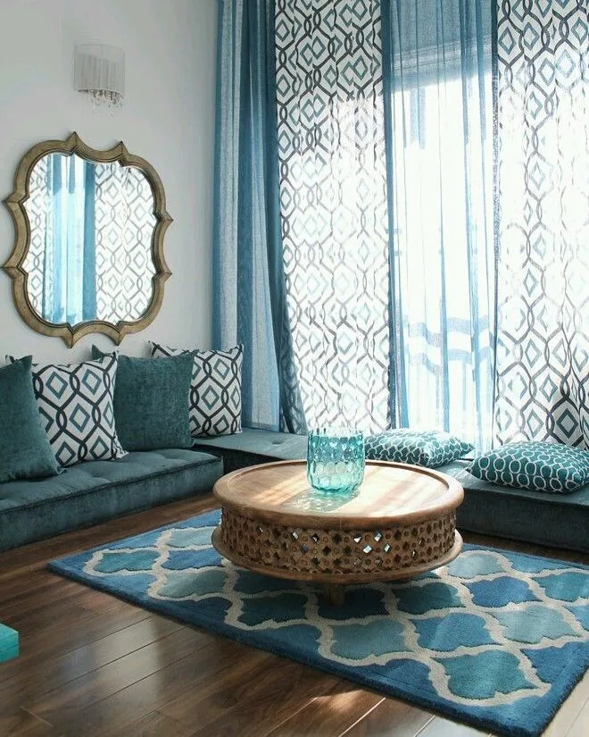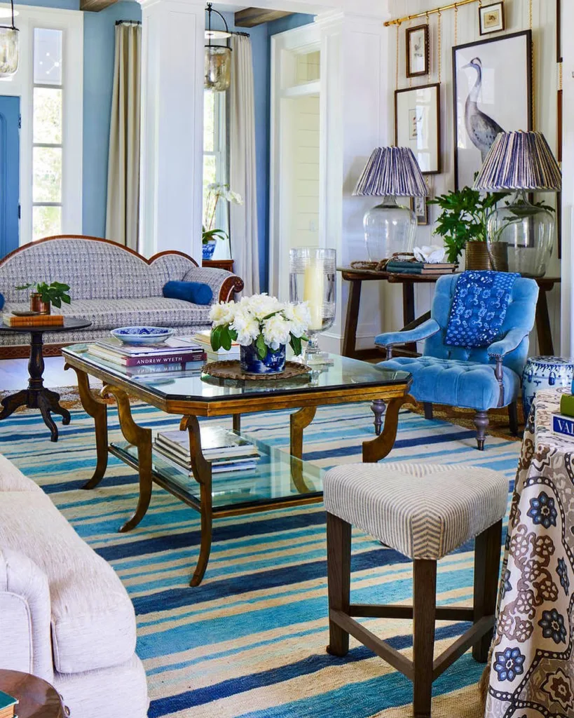 Rugs and textiles are an easy way to introduce blue without permanent changes. A large blue area rug can anchor the room, defining the seating area while adding warmth underfoot. Look for patterns like geometric designs or abstract swirls in shades of cobalt or turquoise for a contemporary feel. Blue curtains or drapes, whether sheer or heavy, can frame windows beautifully, adding elegance and softening the space.