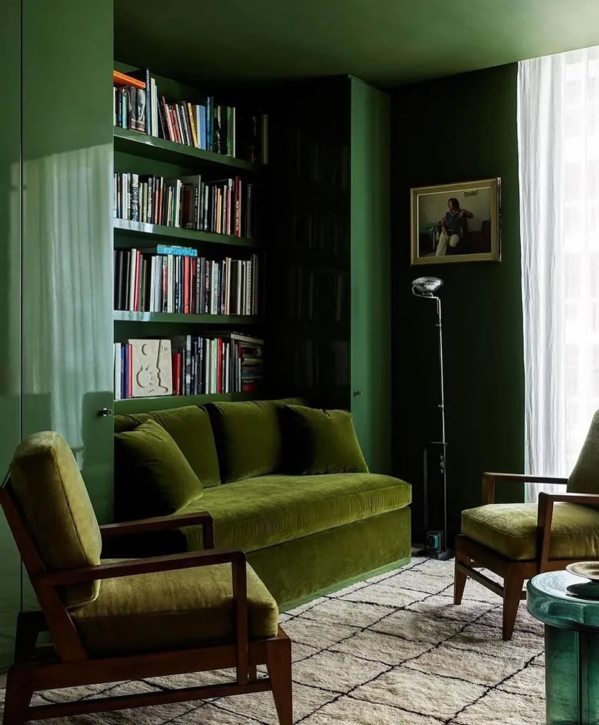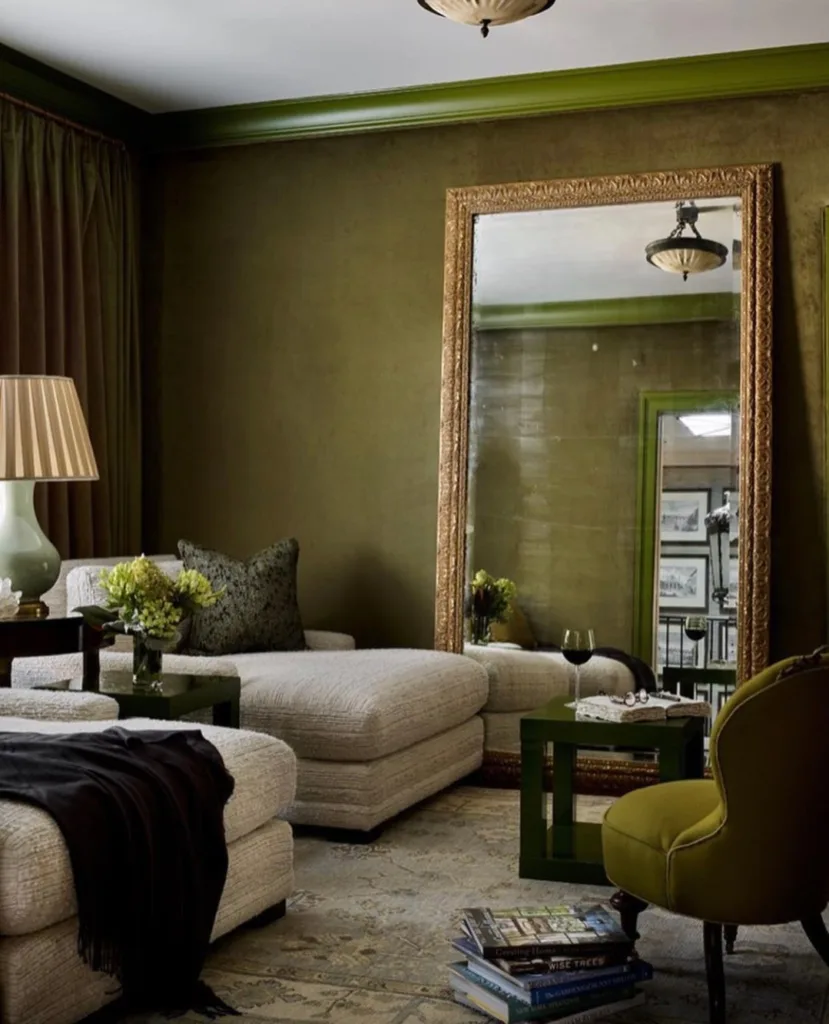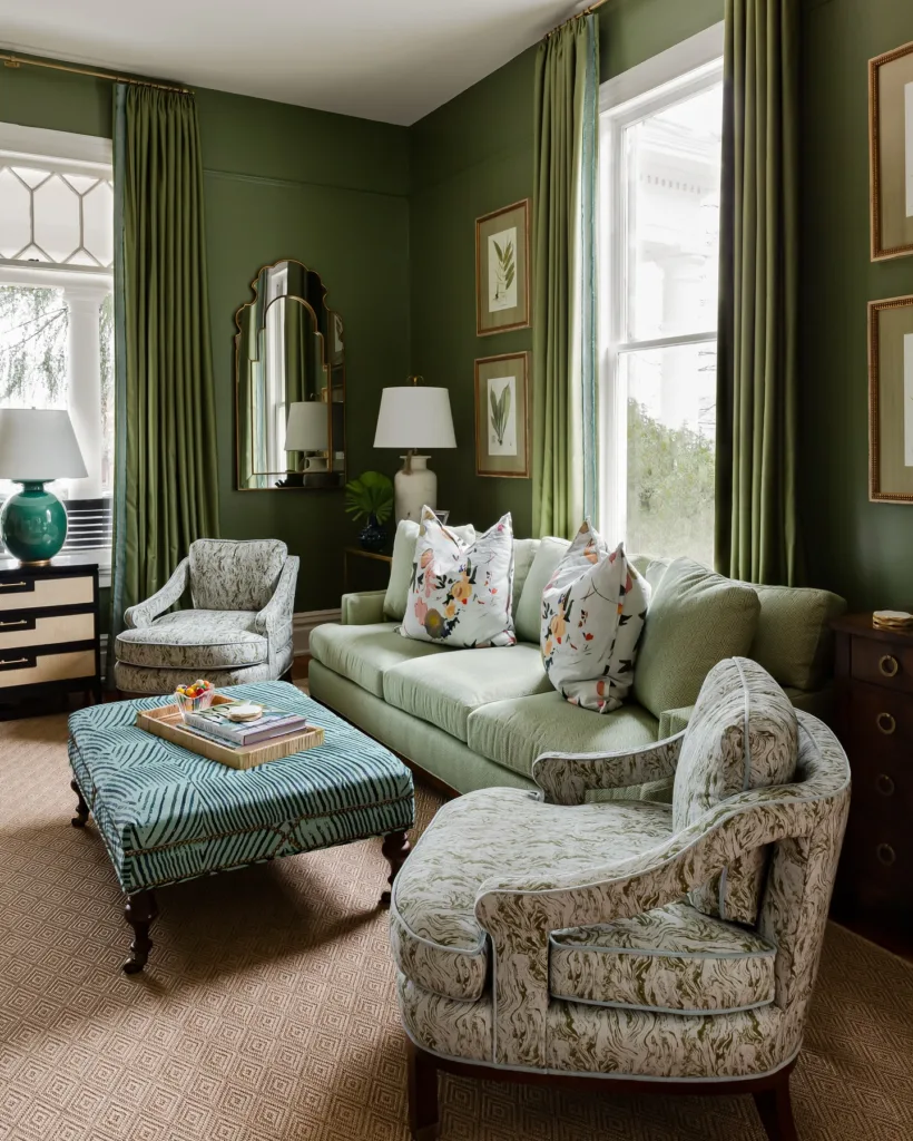 Designers favor deeper tones like olive, emerald, and forest green over lighter sages, for a more grounded, luxurious feel.